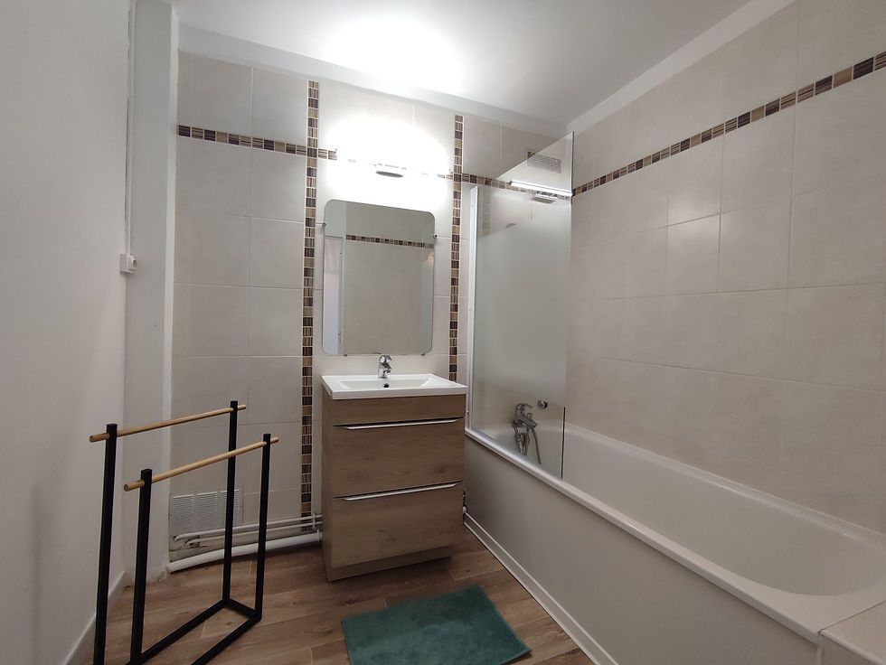 Salle de bain avec vasque et 2 tiroirs de rangement, une baignoire, un miroir, branchement pour machine à laver.